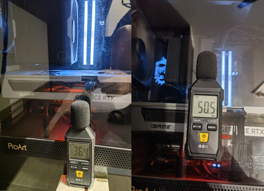 从上面的测试结果里还能看到,JF150RS的两颗10cm小风扇在R23时转速已经来到了2300转,从而产生了比较大的噪音。但是在游戏场景中,两者的噪音都可以忽略不计。