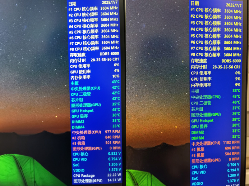 两者的温差为7℃左右,62℃这个数值作为CPU在游戏这个场景的温度,可以说是被稳稳压制了,温度表现令人意外。