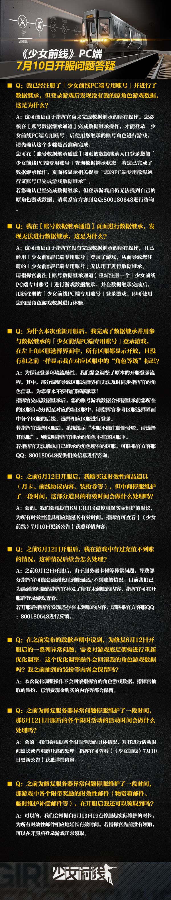 《少女前线》制作组今天宣布,经过项目组和运维团队的修复调整,Steam版(继承版)将于7月10日上午10点结束维护重新开服。为保障指挥官的游戏体验,官方对先前6月12日开服后的各项活动内容和时间进行了相应调整,详情可查看下方长图。