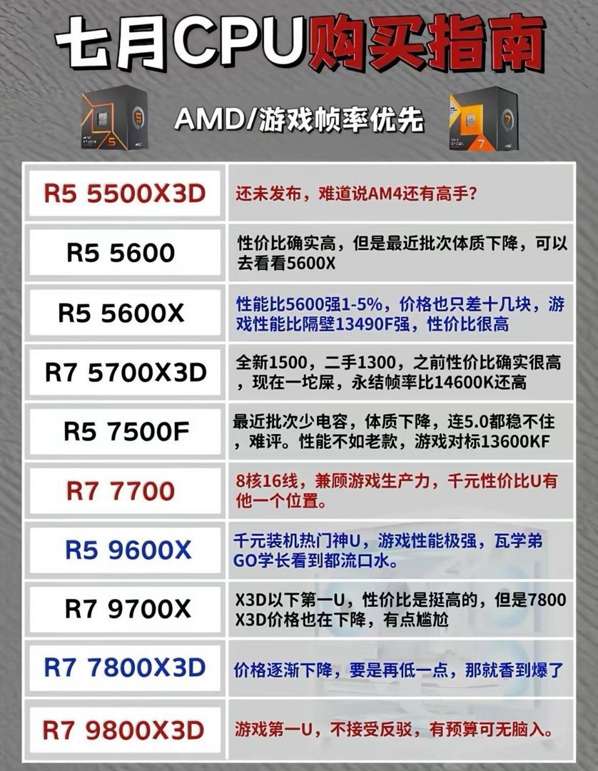 七月电脑圈CPU推荐 2025-07-09 数码硬件 七月份电脑该如何选择CPU呢 是生产力需求还是纯游戏需求 预算该如何选择最具性价比的CPU跟最适合自己的CPU呢 更多游戏资讯请关注:电玩帮游戏资讯专区 电玩帮图文攻略 www.vgover.com