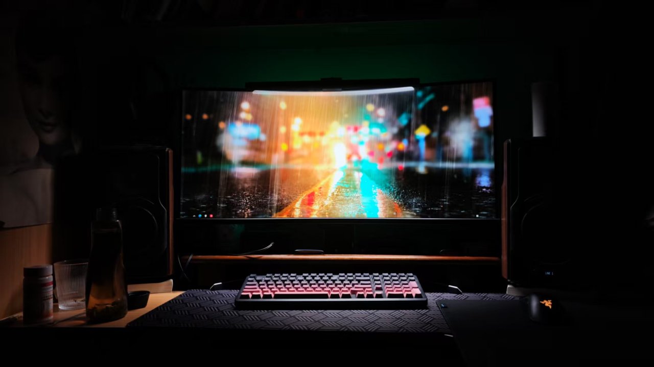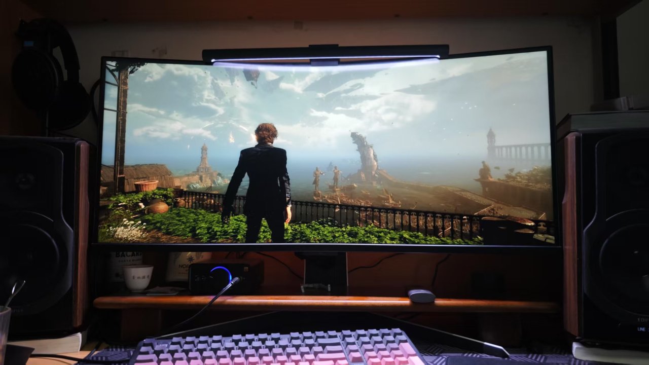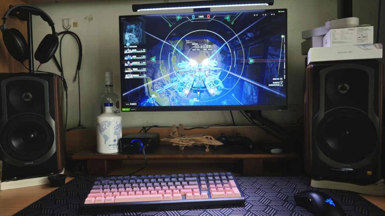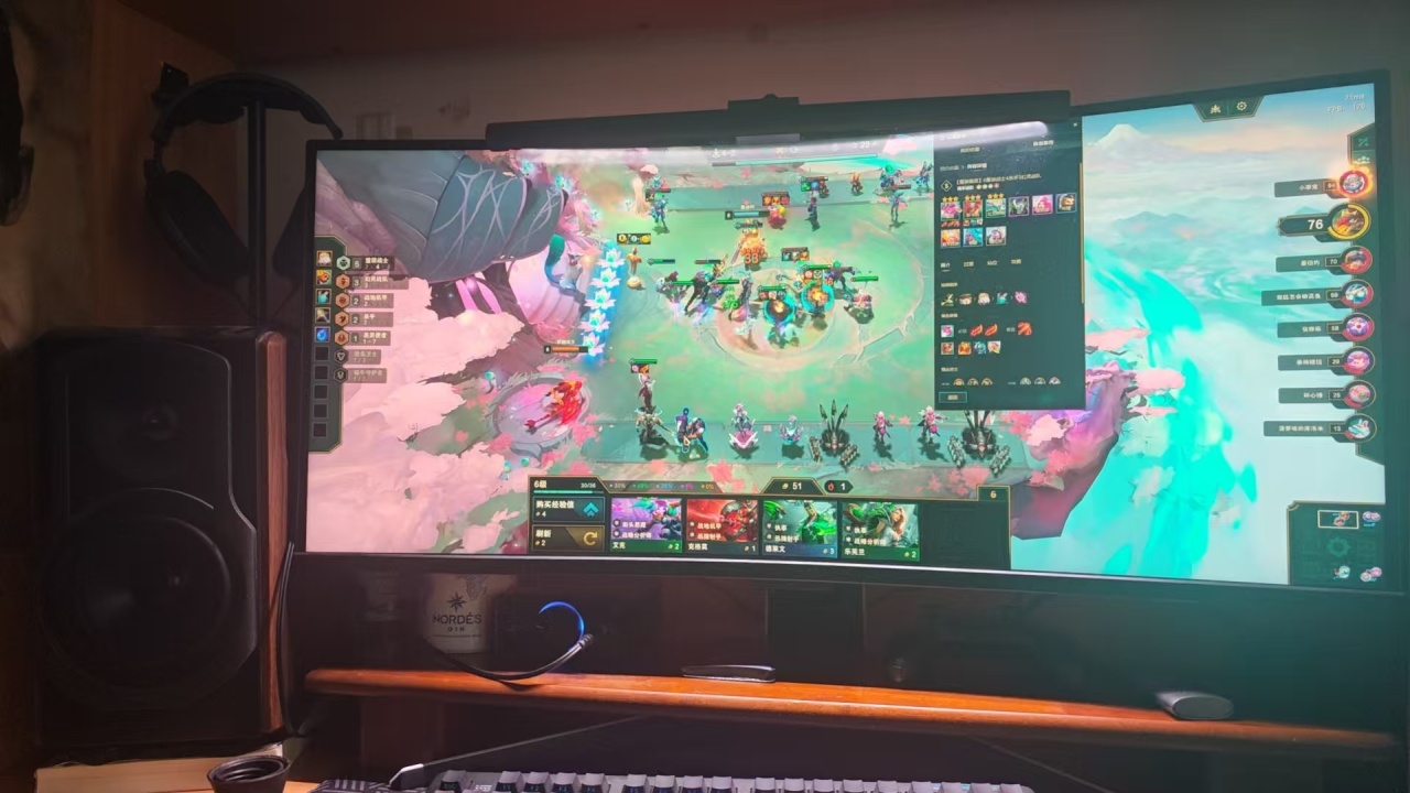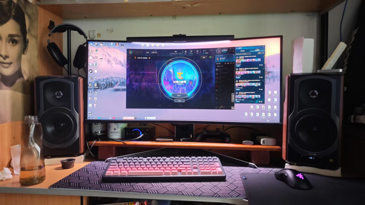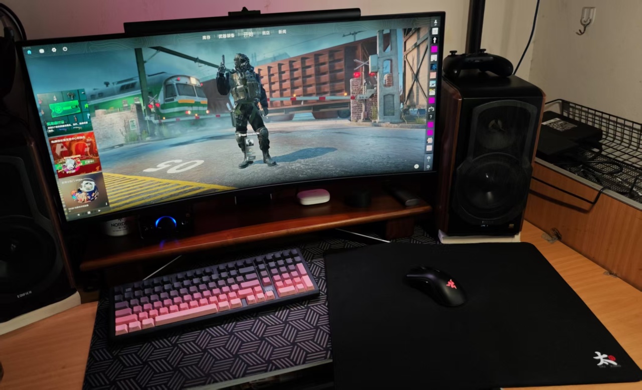 带鱼屏幕+一对大音响占满了所有桌面长度,完全放不下更多东西了。