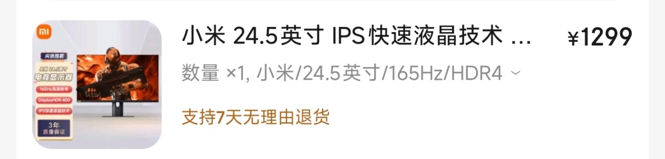 元旦前,终于攒够买显示器的钱。1299元,购入小米24.5寸165HZ显示器。