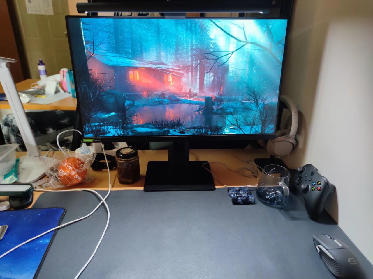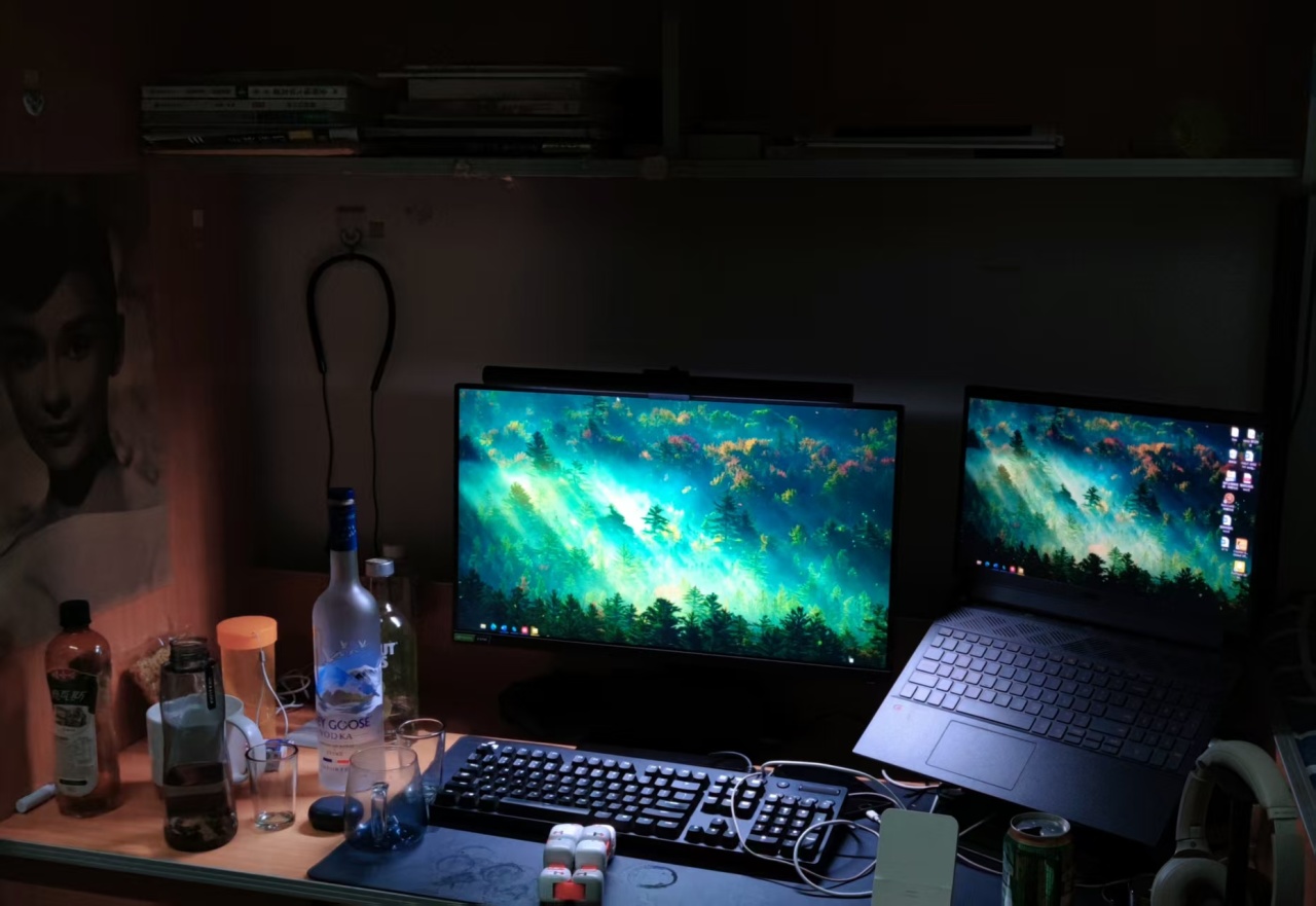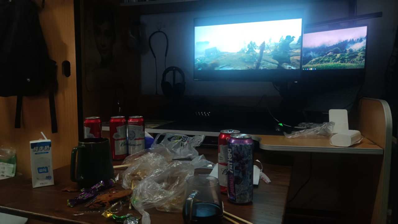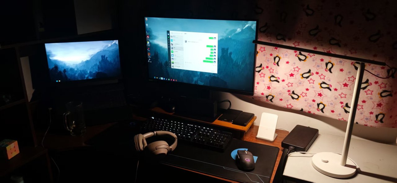 过年回家,双屏展开。桌搭1.0由此成型,那几天怎么看怎么舒服。窗外下着大雪,台灯暖光照亮桌面,什么事情都没有,打开Steam,打派、玩地平线4、玩魂3......什么都可以,累了就直接睡觉。