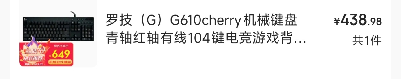 临近过年,换新键盘。学期末写小论文的时候,室友嫌我青轴声音太大,加上杂牌键盘确实不好用。438元购入罗技G610红轴键盘。