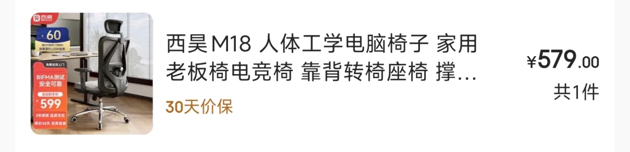 购入工学椅,更加舒服。六人宿舍太挤,每个人的可使用空间太小。换到四人宿舍后第一时间购入西昊M18工学椅,579元。