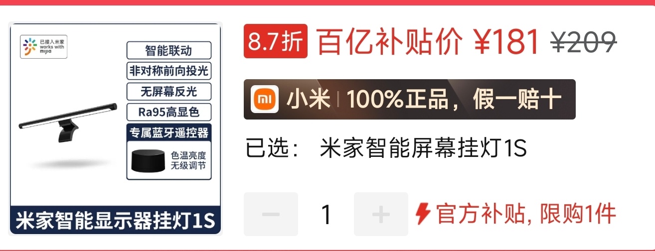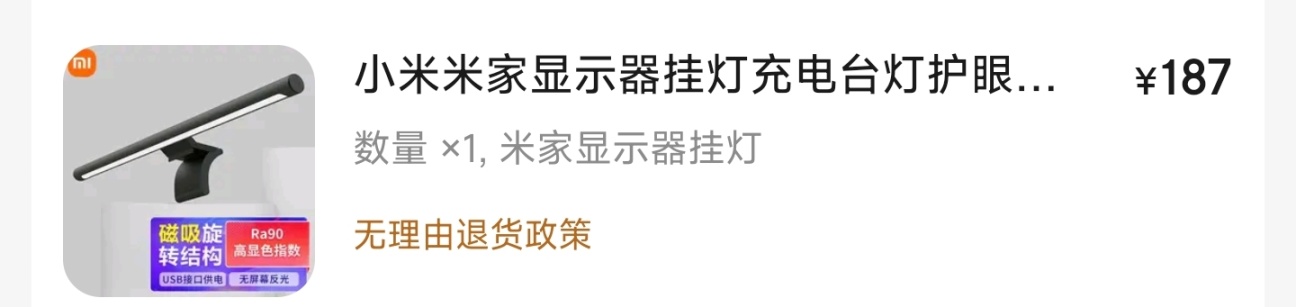 又考虑到显示器晚上太亮,考虑购入显示器挂灯。当时考虑到别的大牌子太贵了,杂牌信不过,就购入小米显示器挂灯,178元。