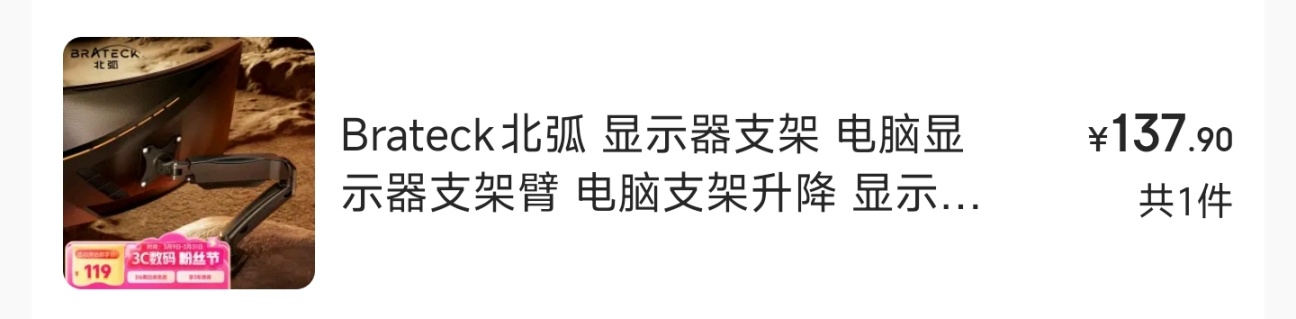 购入显示器支架臂,137元。坐的舒服了,就又想看的舒服,显示器支架臂必不可少。随便延伸,控制角度,对于FPS玩家必备。