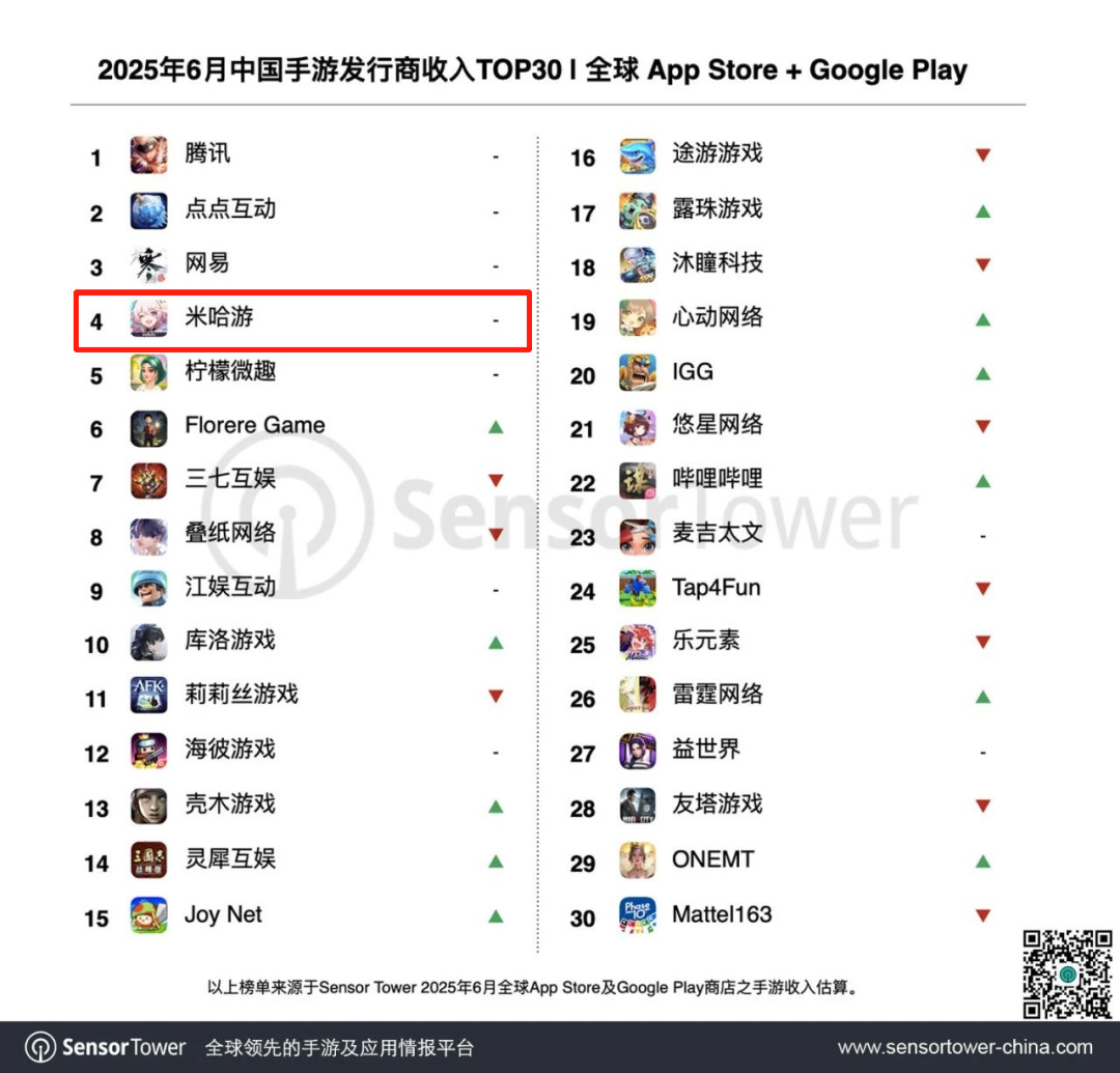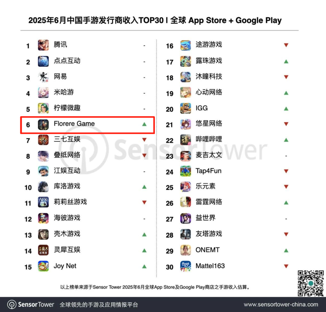 最近,Sensor Tower发布了2025年6月中国手游发行商在全球App Store & Google Play的收入排行TOP30。(下称TOP30,仅统计发行商收入,且不包括中国地区第三方安卓渠道)