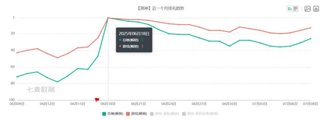 在新版本的推动下,《原神》日流水迎来大幅上涨,在版本更新次日即登顶iOS游戏畅销榜,还冲上了畅销总榜第一的位置,6月全球收入大幅增长72%。