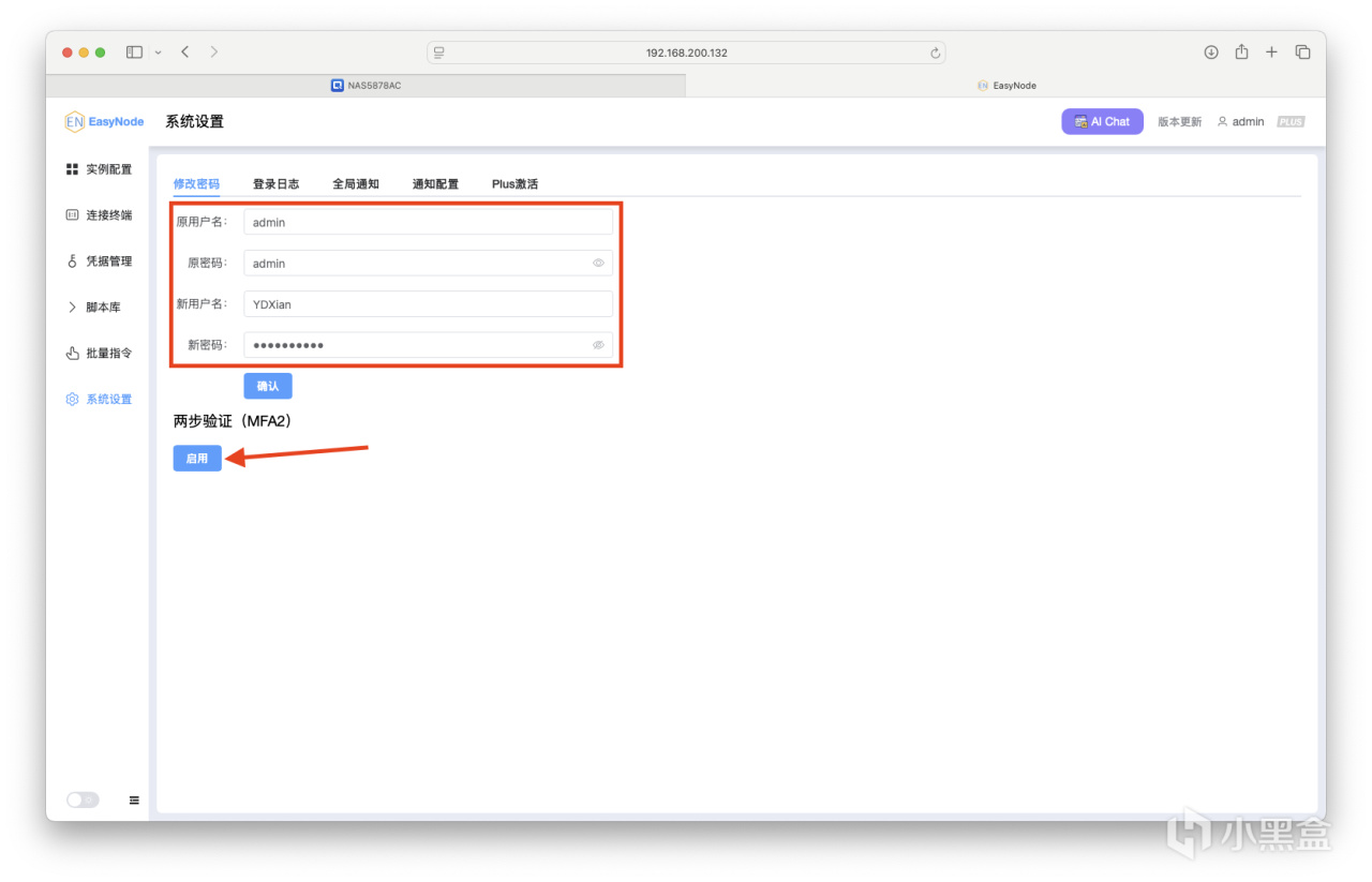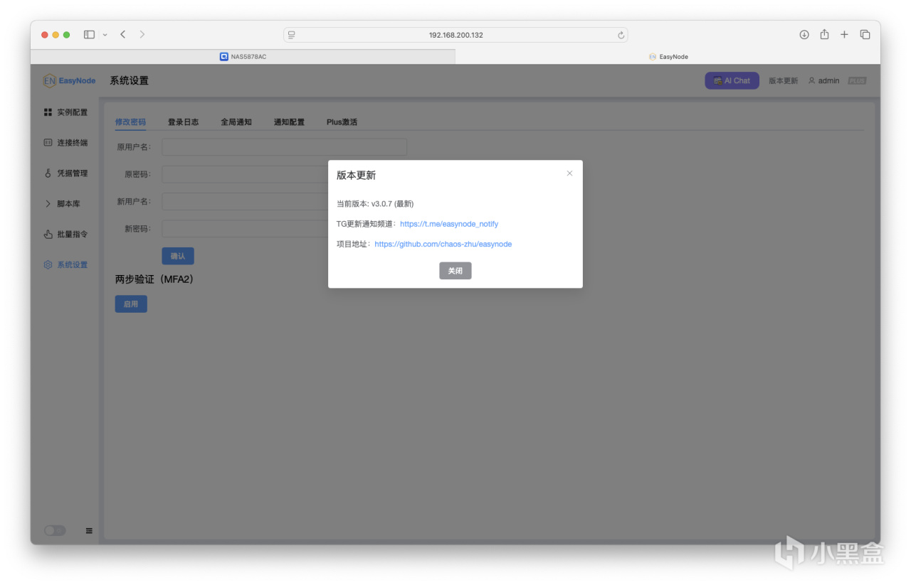 系统设置部分,支持配置两步验证、全局通知等。