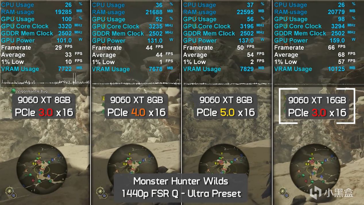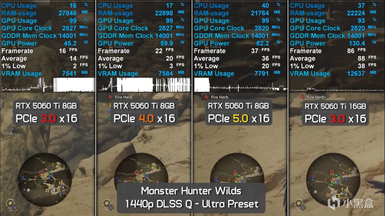 实测环节,即使是5.0 x16,怪物猎人:荒野也出现了只有36帧,1 Low 只有20帧的情况。显存直接爆了个干净,游戏彻底摆烂了。4.0 下则只有20/3。