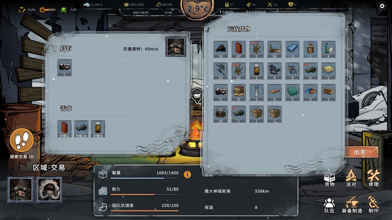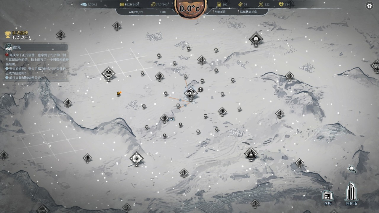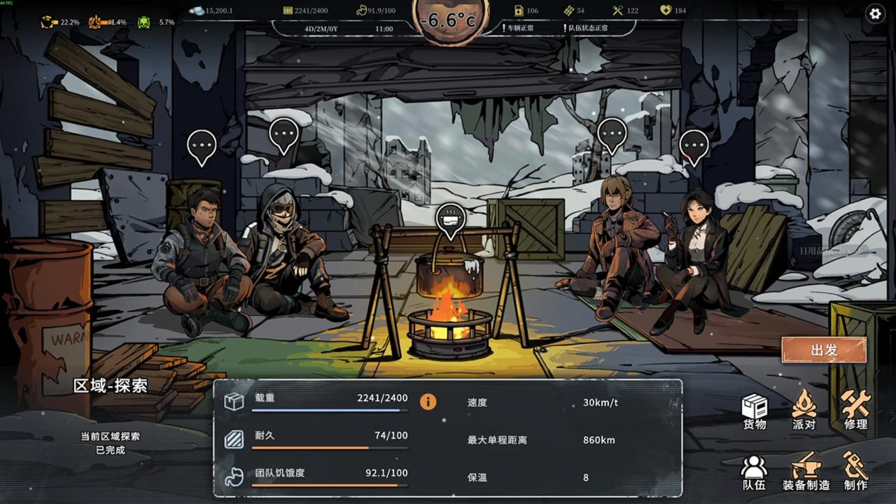 路途中可以历经风暴,车内温度骤降,需要消耗燃料来驱散寒冷。气温过低,会减少每回合的行动点数。