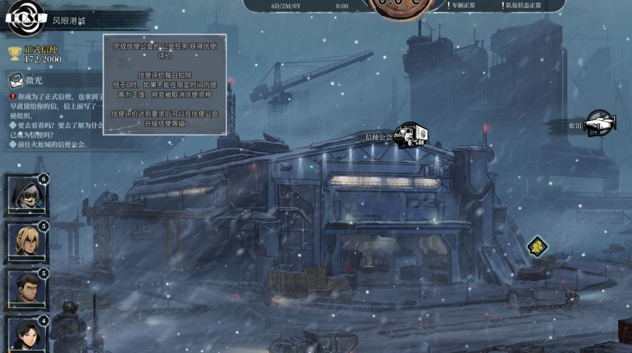信使也不好当,还有KPI业绩要求。每日会掉信使评分,降至0就失去铁饭碗。更高的信使等级,可以在各个避难所交易到更珍惜的物资。