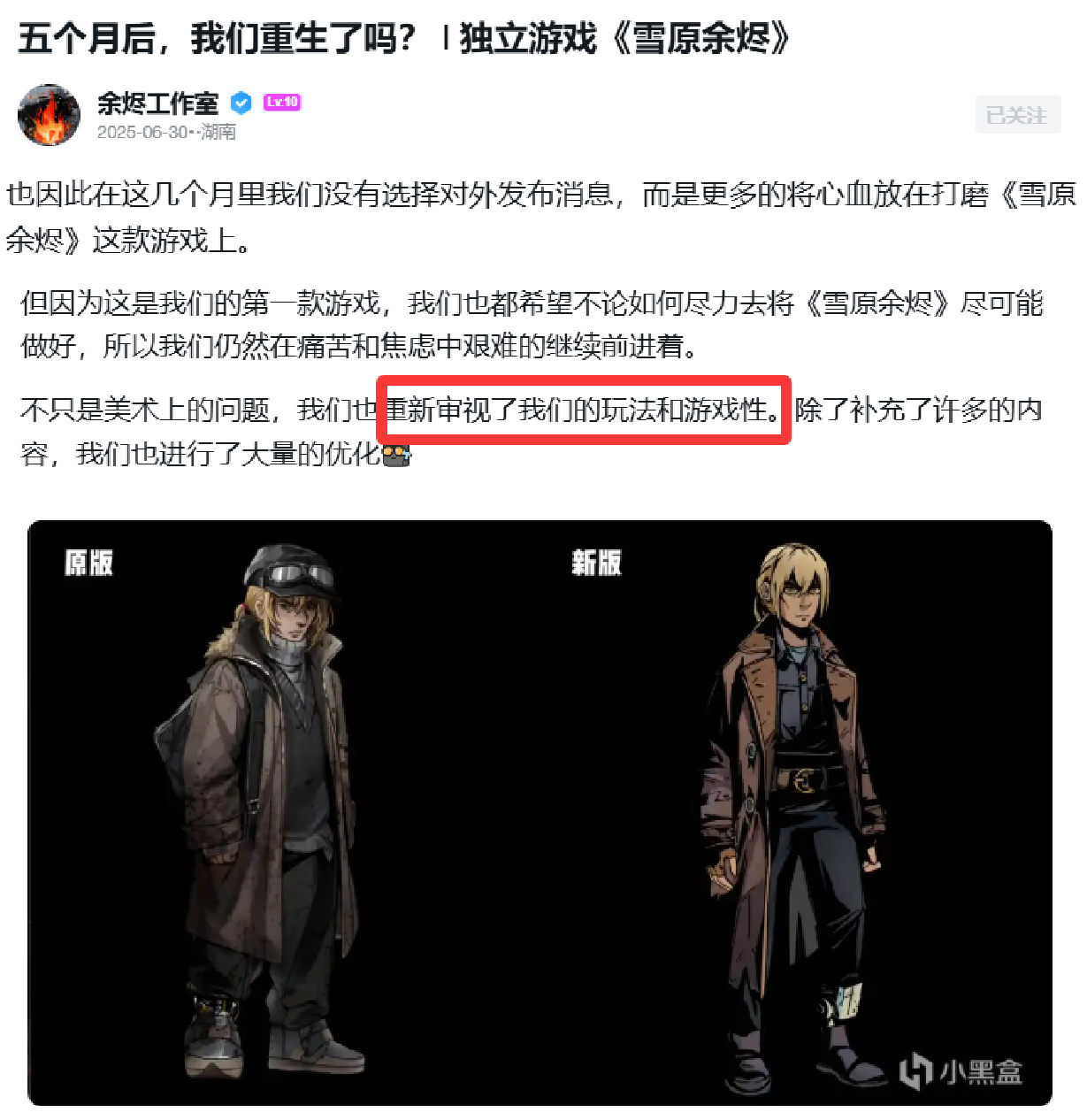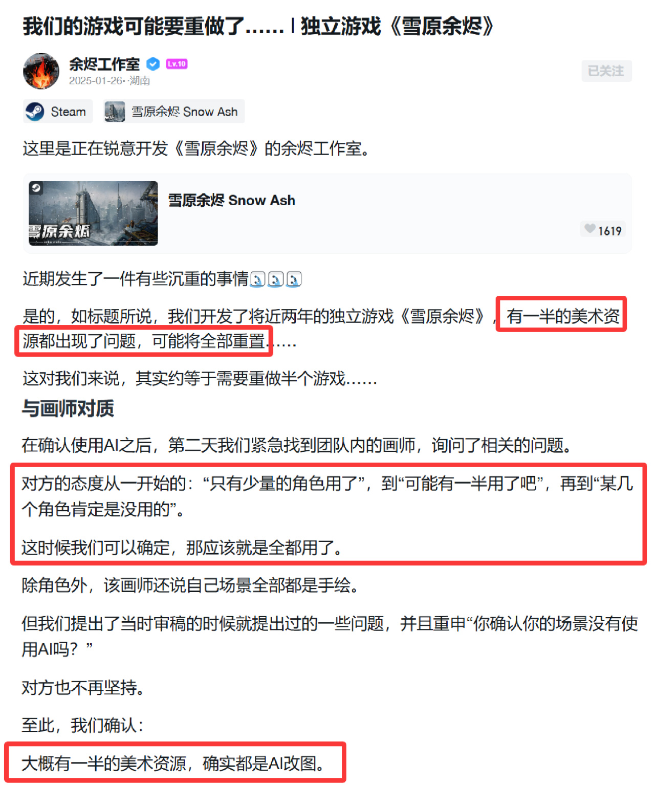 今年年初,我刷到了《雪原余烬》的帖子。制作团队的画师在人物立绘上使用AI。有错就要改,挨打就立正。于是,他们寻找新画师,重做这部分美术资源。