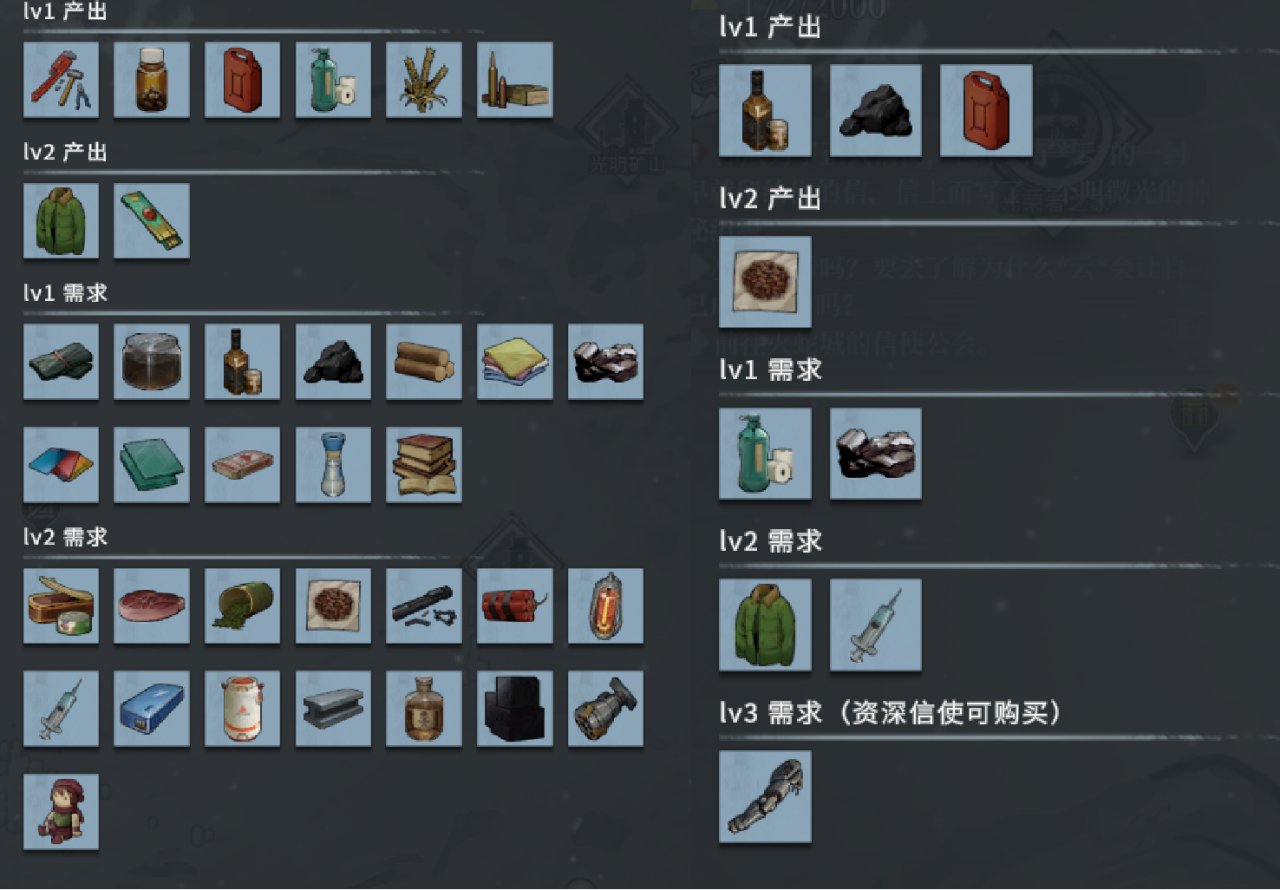 世界散落着46座大中小型避难所,产出和需求不同。例如,矿山产出石油、煤炭,急缺棉衣和药品;城镇产出棉衣食物,急缺煤炭以及工业品。