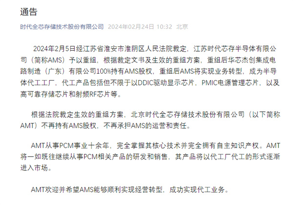 作为原AMS股东的北京时代全芯存储技术股份有限公司(简称AMT),就相关事项做了通告: