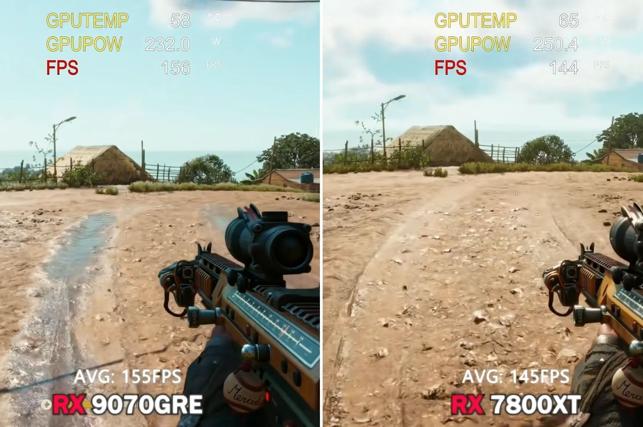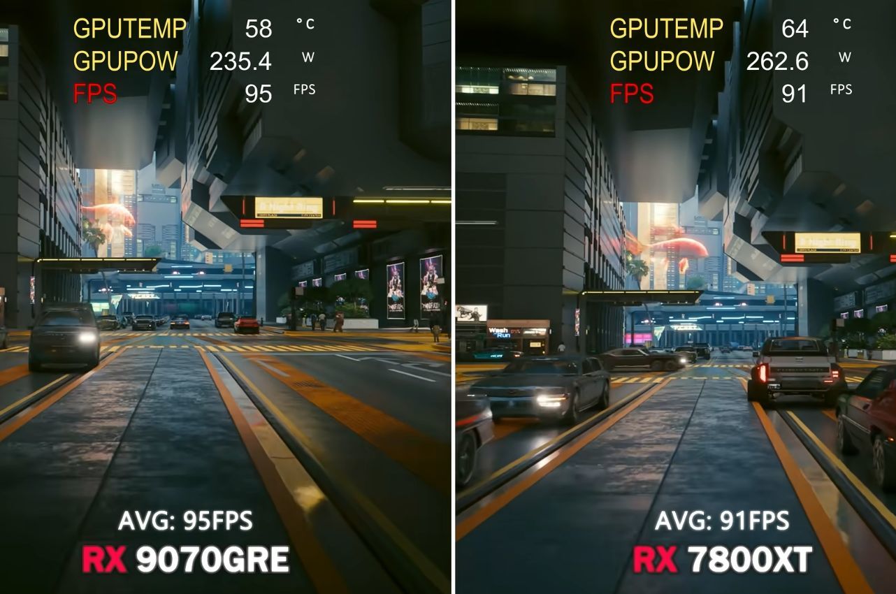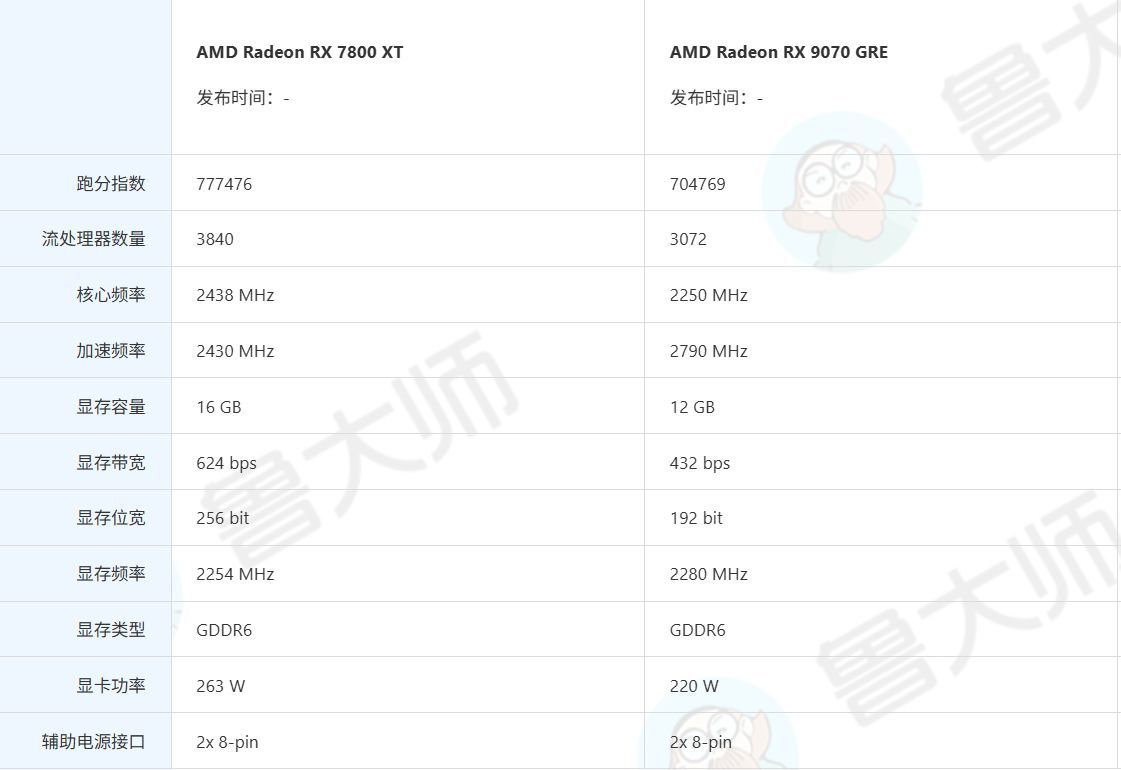 以上则为9070GRE和7800XT的游戏帧数对比,这两款显卡的差距非常小,9070GRE领先5%的游戏性能,在温度和功耗控制上也相对有优势;但是9070GRE显存仅有12GB,流处理器数量和显存带宽方面均不如7800XT