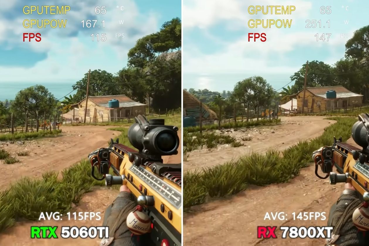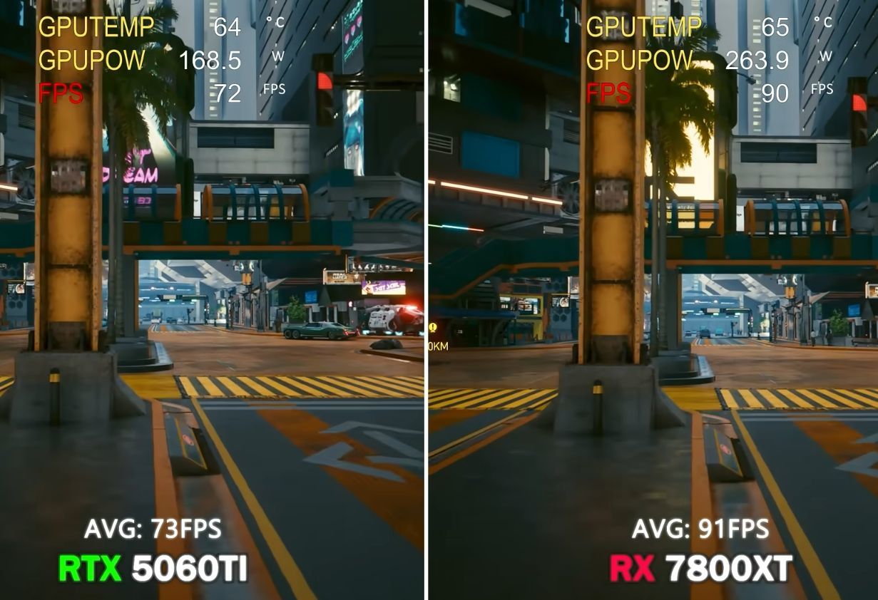 以上为5060TI 16G 和7800XT 16G的一个对比,整体游戏的一个帧数7800XT要比5060TI领先25%左右;尽管7800XT的功耗更高,但是两者温度几乎持平;这么一对比5060Ti似乎失去了应有的竞争力