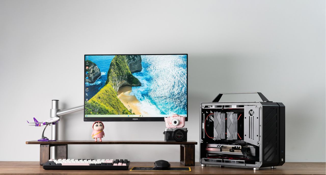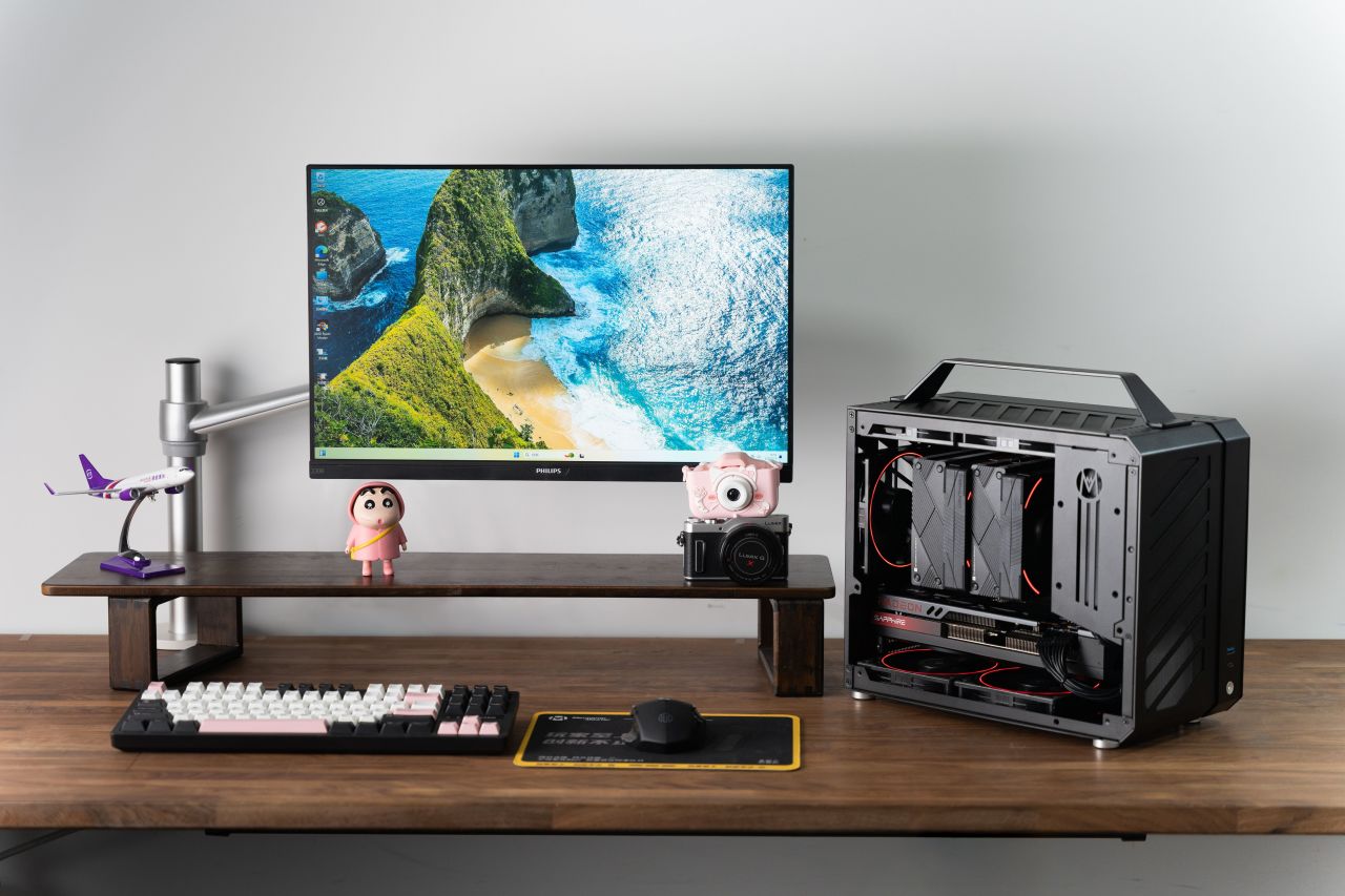最后搭载所有硬件选用了机械大师C28机箱,其作为迷你MATX机箱,自带一个便携提手,与常规MATX海景房机箱相比要小接近一倍的体积,主打一个节省桌面占用空间;本套依旧是采用紧凑型的搭配和合理的风道配置,为了就是不浪费一丝的机箱空间