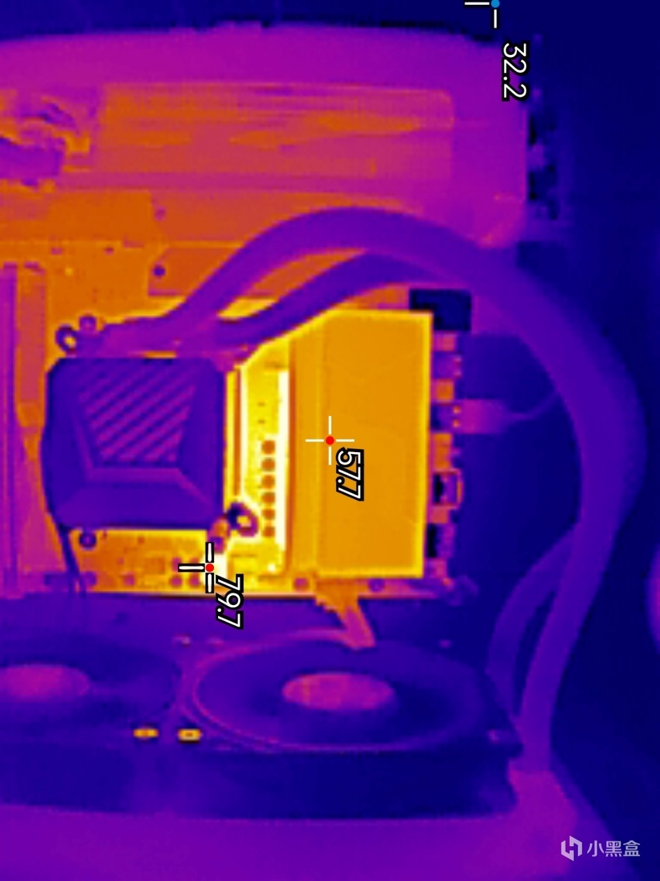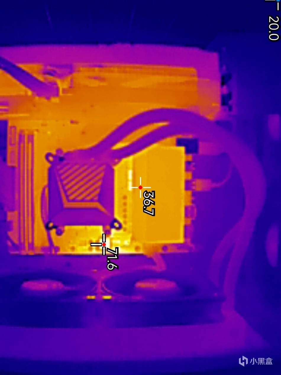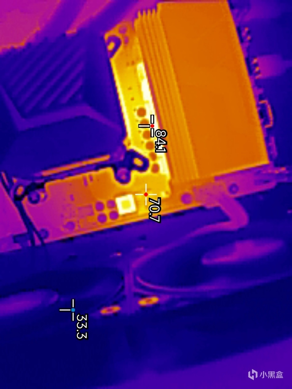 ▼這裏簡單的找一下左側供電電路模組的最高溫度,在84.1℃左右,這個溫度表現其實也還好,畢竟這是室溫28℃的大夏天。右側的1相供電溫度更低了,僅有70.7℃,被風扇吹的溫度降低了好多。