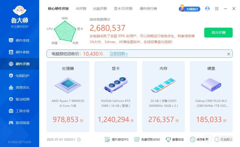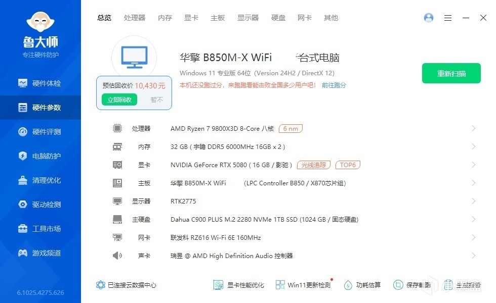 ▼簡單看下整機配置,處理器是9800X3D,主板是華擎的B850M-X WIFI,顯卡是影馳的RTX 5080金屬大師白金版OC。