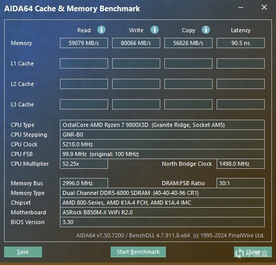 ▼簡單跑個內存的讀寫測試,內存讀取速度59079MB/s、寫入速度80066MB/s、複製56826MB/s,延遲90.5ns。這裏沒優化小參,簡單優化之後,內存延遲會有明顯下降。