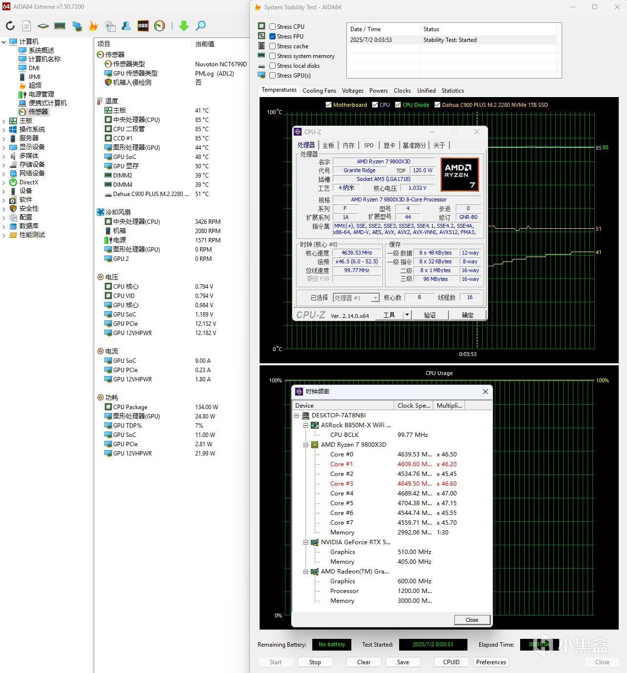 我本以爲,華擎的這塊B850M-X主板肯定也是和那些字母結尾的主板一個水平,搭配入門級的處理器應該也算可以,中端處理器都很難上去,滿載烤雞比降頻。但華擎的“妖板”血統穩定發揮,這塊B850M-X主板,可以實實在在的抗住9800X3D處理器滿載運行不降頻,有點離譜的。