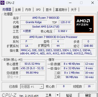 ▼簡單看下9800X3D的硬件參數,其擁有8個大核16線程,三級緩存96MB,非常給力。