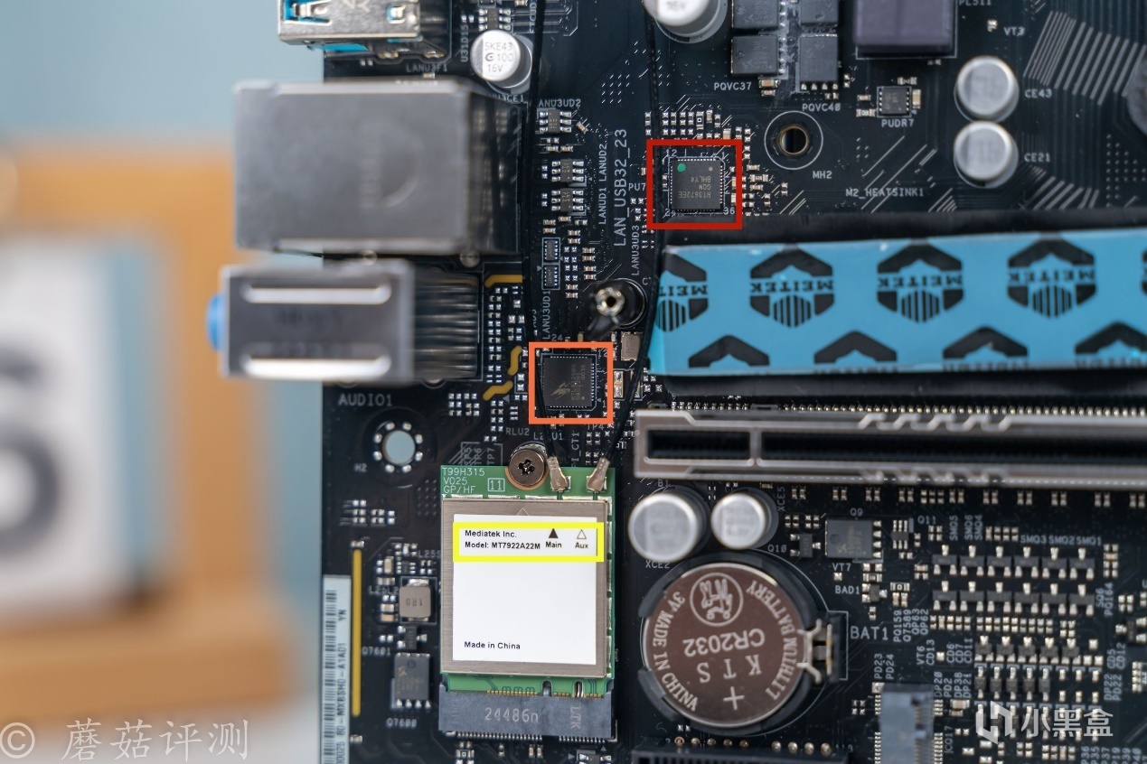 ▼主板供電電路的左下角,還有一顆紅框芯片,絲印RT3672EE,PWM主控芯片,負責旁邊的1相供電控制。橙框芯片絲印RTL8125BG,2.5G的有線Lan口主控芯片。下面那個大的是黃框是無線網卡芯片,MT7922A22M,聯發科出品的WIFI 6E無線網卡。