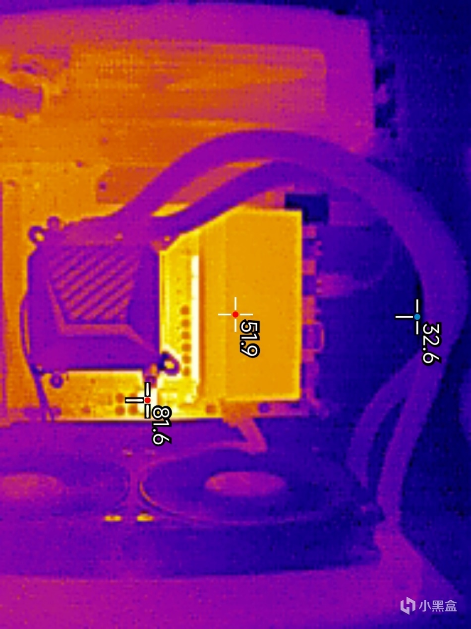 ▼穩定輸出100W的功耗,主板左側散熱片的表面溫度在51.9℃左右,右側的1相供電芯片溫度提升卻不明顯,在81.6℃左右。
