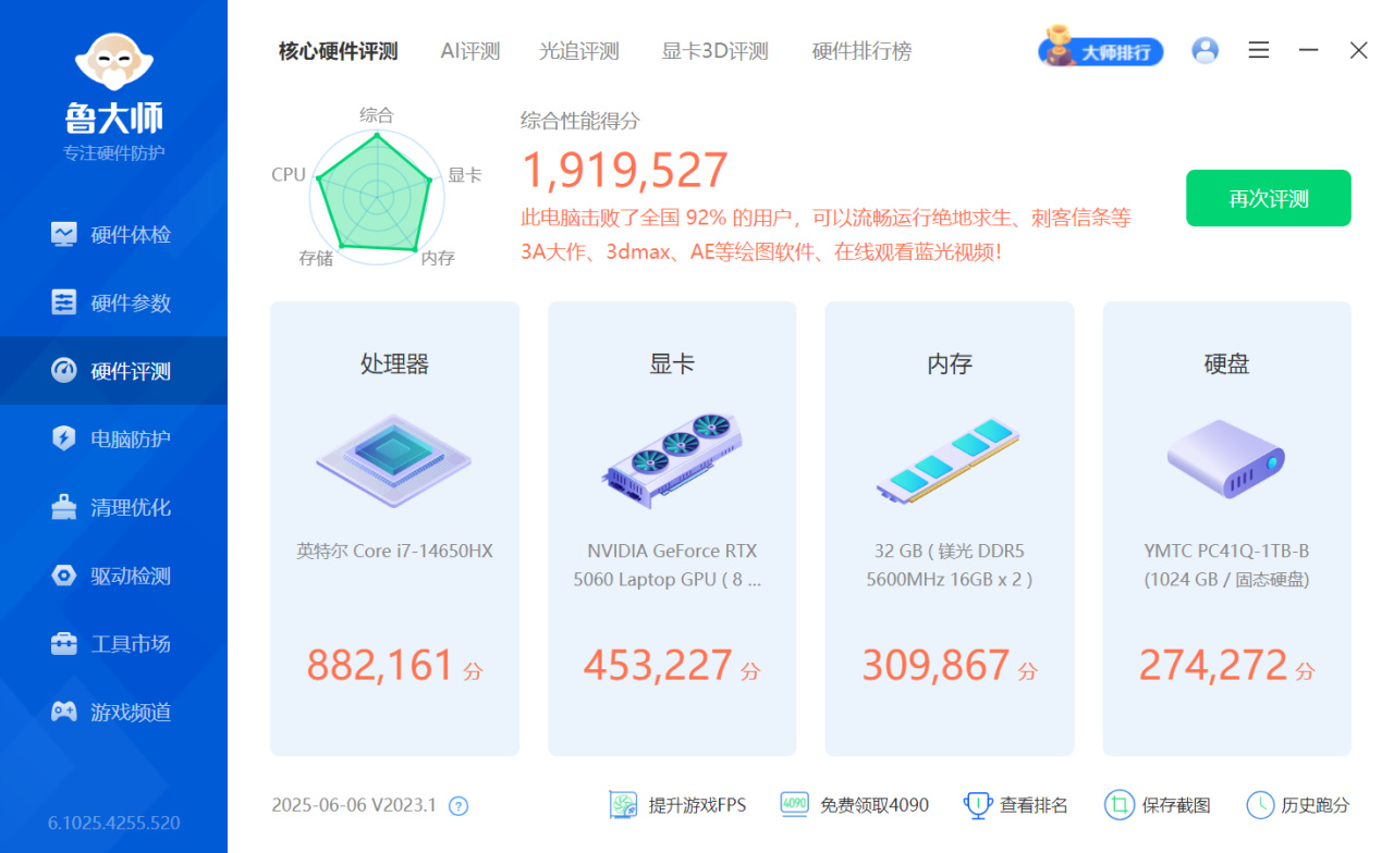 ▼用鲁大师来跑一个整体分数,最终成绩191.95万分,击败全国92%的用户,基本上抱着这台电脑就可以横着走了。CPU分数88.22万分,显卡分数45.32万分,上一代RTX 4060笔记本GPU跑分普遍在40万左右,相当于大约有12.5%的性能提升,iGame M16 Origo 能够完全释放出i7+RTX 5060的性能。