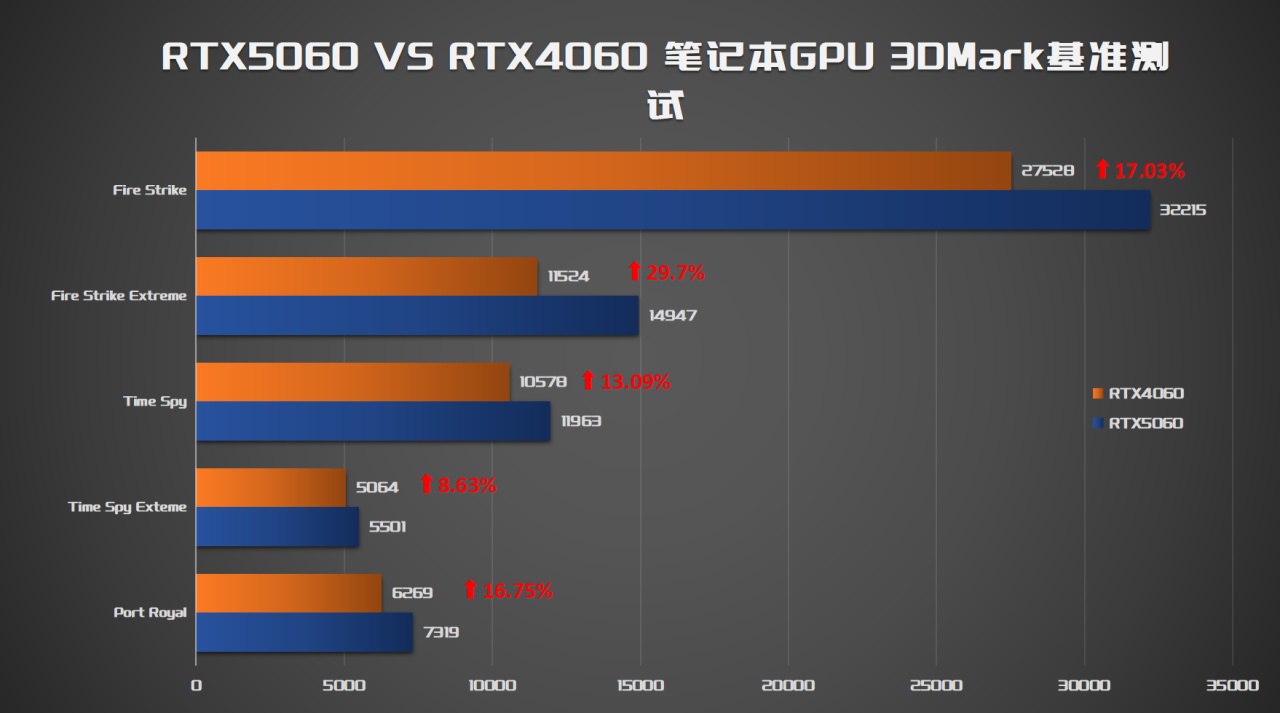 ▼在Fire Strike、TimeSpy、Port Royal三个测试项目中,RTX5060笔记本GPU相较RTX4060笔记本GPU平均提升在18%左右,其中提升幅度最大的是FSE,提升幅度达到了29.7%,提升幅度最小的是TSE,提升幅度8.63%,详细对比数据可以参看下表。