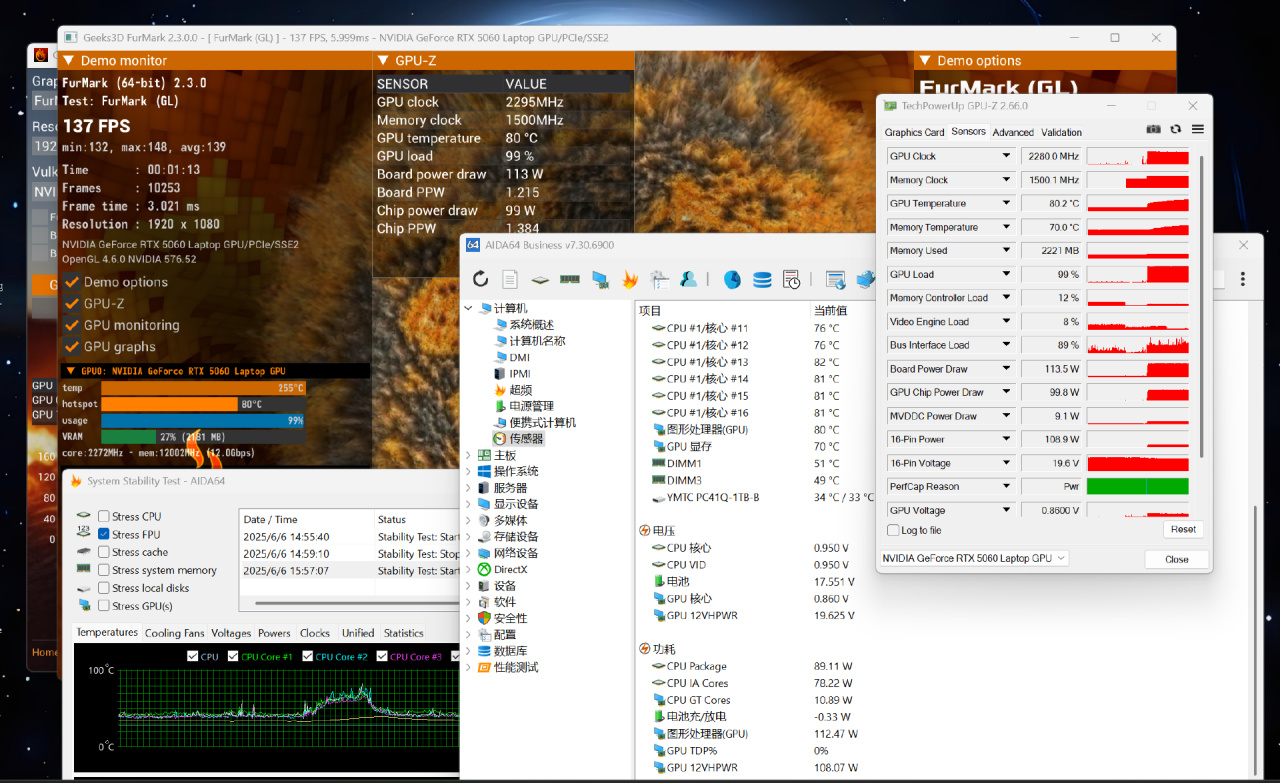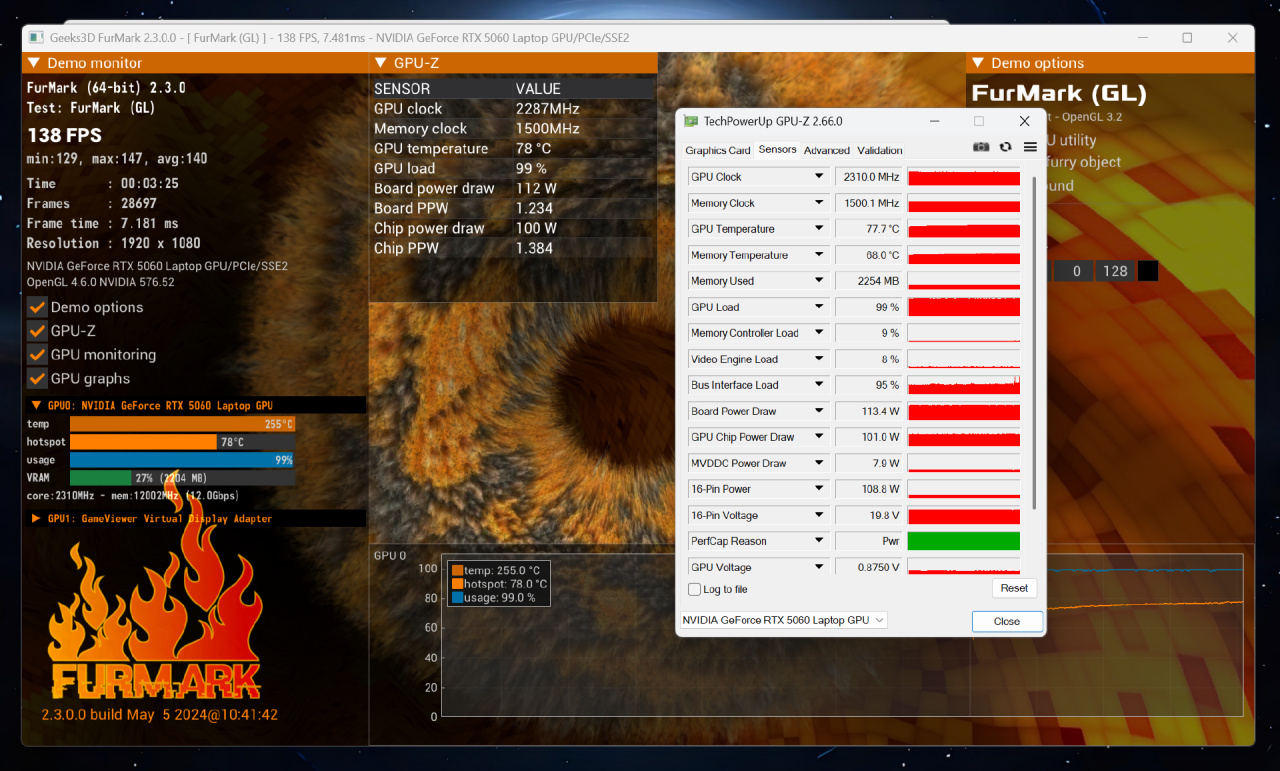 ▼对于iGame M16 Origo 大家都很关心其散热性能,我这里就把FurMark烤显卡放在最前面,压力测试时长3分钟,测试分辨率1080P,最终测得GPU频率2310MHz,GPU温度在77℃左右,显存温度68℃(这个着实控制的很好),显卡实时功耗114W,显卡芯片功耗101W,达到了显卡的最高功率。