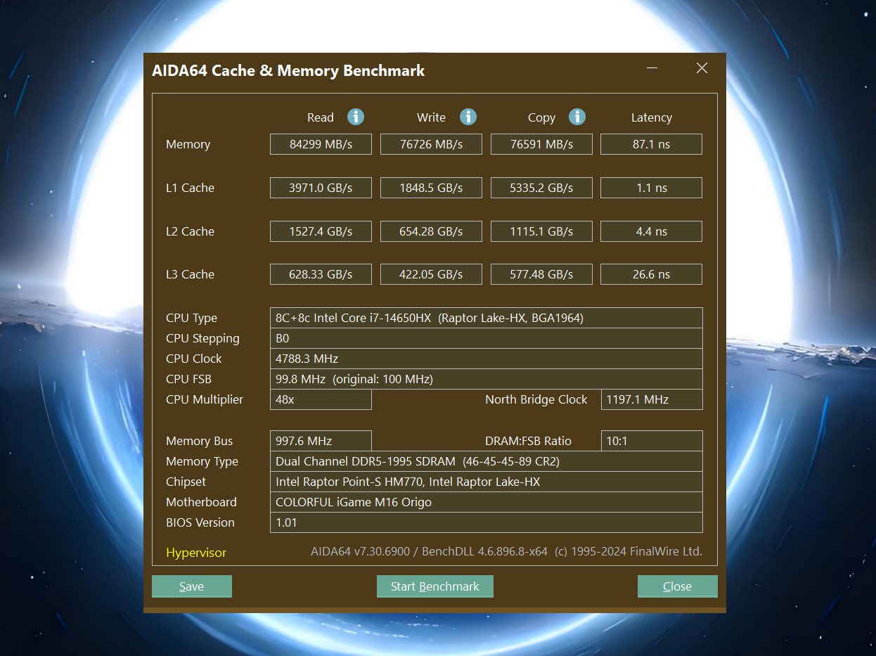 ▼使用AIDA64对内存进行测试,DDR5内存在5600MHz的频率下运行,读取速度84299MB/s,写入速度76726MB/s,复制速度为76991MB/s,延迟87.1ns,作为5600MHz频率的DDR5内存,这个读写能力还是很强的。