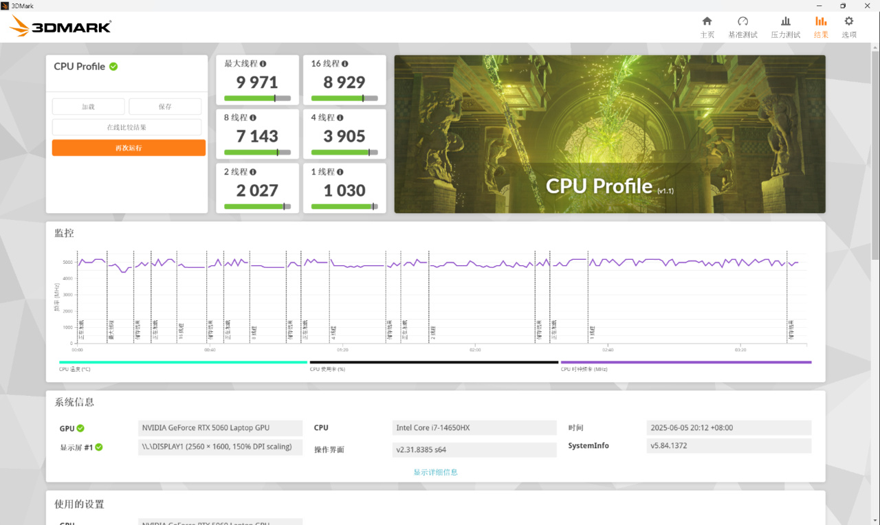 ▼3D Mrak CPU Profile测试,最大线程得分9971,16线程得分8929.