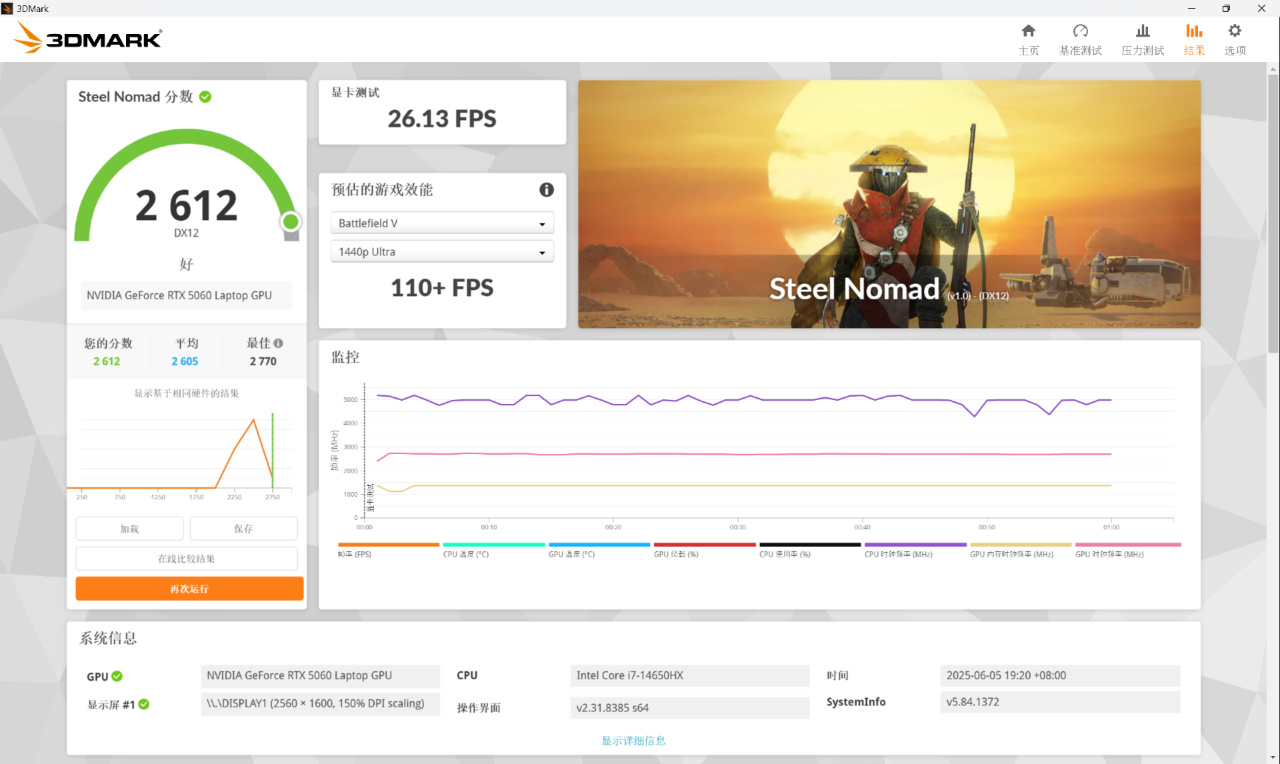 ▼Steel Nomad是衡量的是现代图形API(DX12/Vulkan)在无光追、纯光栅的实际性能,在2K分辨率下最终测得2612分,26.13FPS。