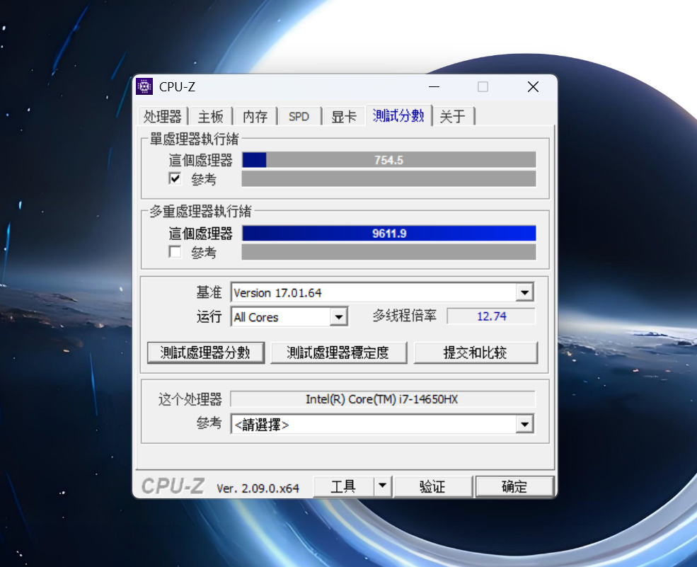 ▼使用CPU-Z对处理器性能进行简单的跑分,最终得出单核成绩为754.5,多核成绩为9611.9,单核性能与上代13650HX差不多,多核性能提升10%左右。
