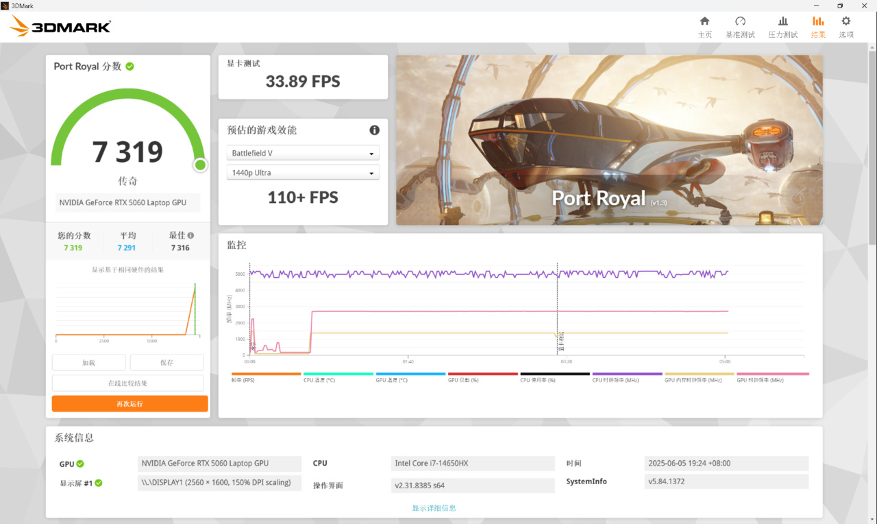 ▼Port Royal分数7319分,显卡测试成绩33.889FPS。