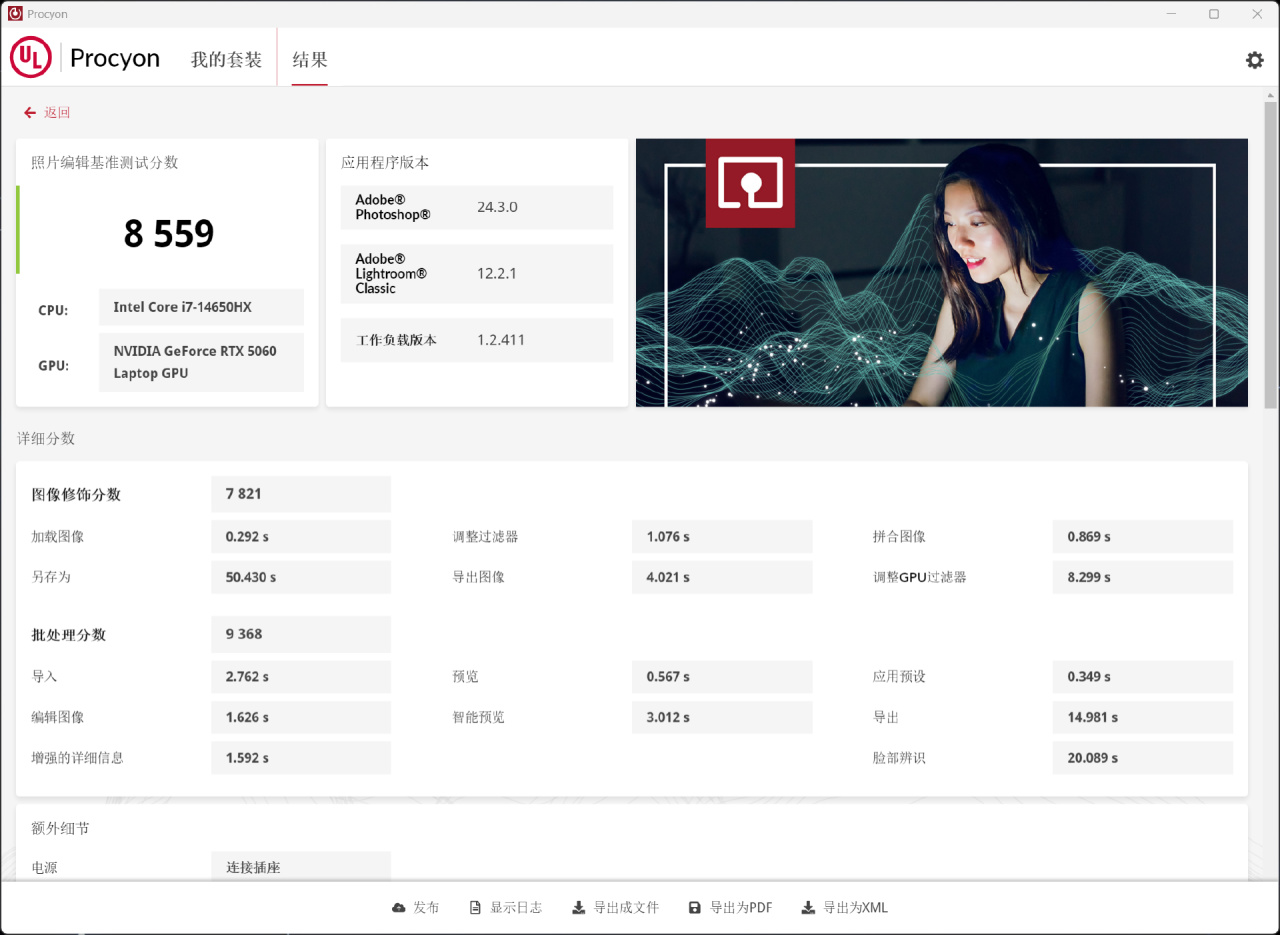 ▼目前AI性能基准测试的量化工具主要是UL Procyon,以我最常用的照片处理性能进行测试,毕竟adobe全家桶已经支持AI功能,对于我这个图文创作者来说,ai降噪已经成为生产工序中不可或缺的环节,最终测得8559分。
