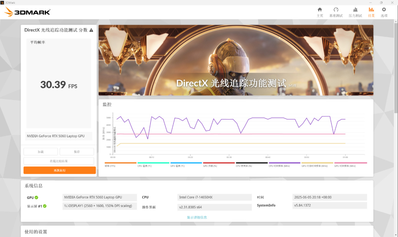 ▼DirectX光线追踪测试结果30.39FPS,从后面的游戏测试结果上看,1080P分辨率下或者是2K分辨率下开启光追,不开启DLSS基本上就是20+到30FPS的水平,在RTX5060上开光追玩游戏个人是不太建议的。