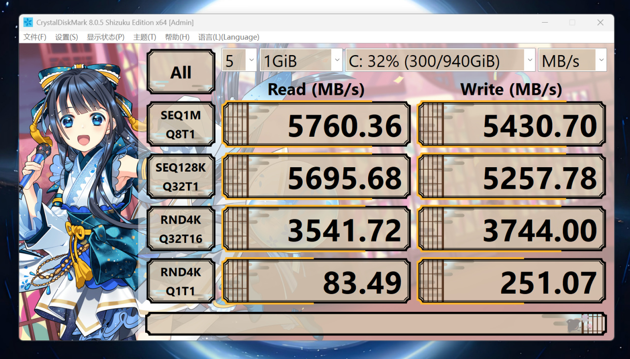 ▼使用CrystalDiskMark进行测试,顺序读取速度达到5760.36MB/s,顺序写入速度为5430.70MB/s,4K读取速度为83.49MB/s,写入速度为251.07MB/s,4K写入性能颇有亮点,整块固态硬盘性能相当不错,1T的存储空间足以应付游戏与创作场景。