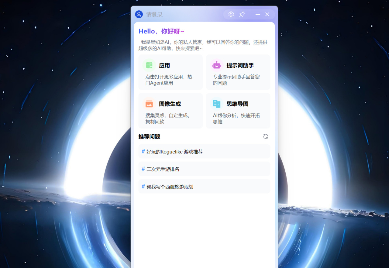 ▼正是为了解决上述的问题,七彩虹部署了星知岛AI应用软件,竖条状的应用UI界面设计让它更像是常驻在我们电脑中的一个高效生产了工具,方便在办公文档铺满桌面的时候无感唤起。软件中集合了各种应用合集、提示词助手、图像生成、思维导图等常用应用,还可以通过对话框直接进行对话。