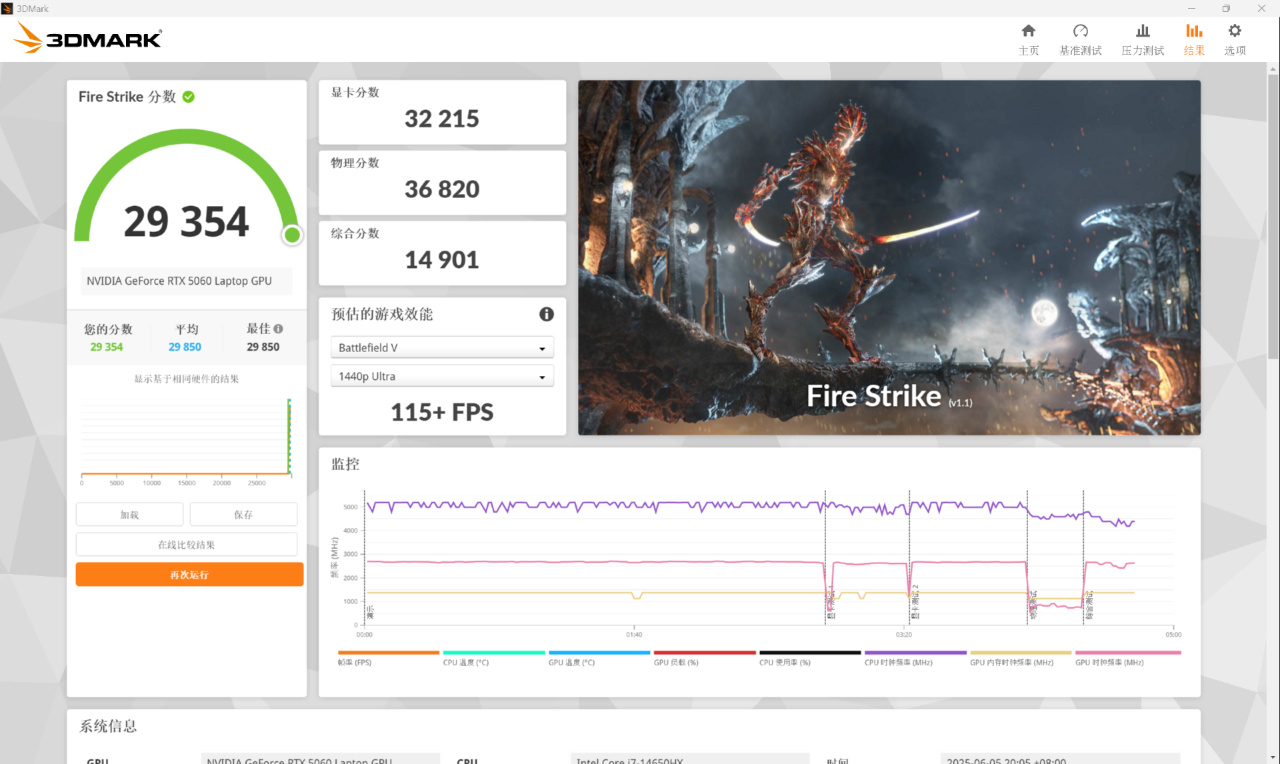 ▼在Fire Strike(DX11)下跑分29354,显卡分数32215,物理分数36820。