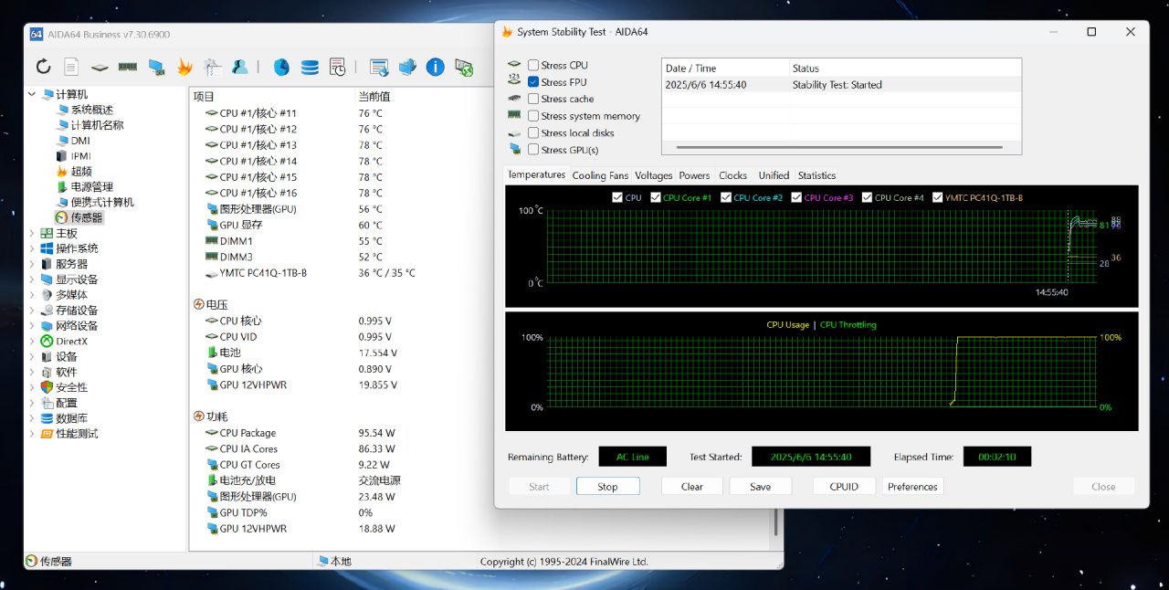 ▼单烤FPU 2分钟,CPU Package 功耗来到95.54W,温度保持在88℃左右,不降频。