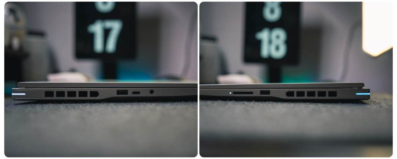 ▼作为一款高端游戏本,M16 Origo提供的接口也是堪称豪华。机身左侧提供了USB3.2 Gen1 Type-A、Type-C接口各一个,以及一个3.5mm音频接口,右侧提供了USB3.2Gen1 Type-A接口、SD卡读卡器(相机用户狂喜)。