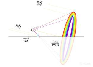 因此,当天空中布满小水珠时,部分水珠会将太阳光经折射、反射后再次折射进入我们的眼睛。由于每个水珠与太阳光、观察者眼睛的相对角度不同,它们会各自呈现出特定颜色。