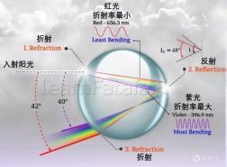 值得注意的是,照射到水珠不同部位的太阳光,会因入射点差异形成不同的折射与反射路径。