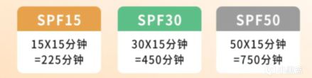 防曬指數SPF:全稱爲防曬指數,表示產品具有防UVB的功效。SPF後面跟的數字,表示產品可以延緩皮膚被曬傷的時間倍數、數值越高,代表防護皮膚不被曬紅、曬傷的能力越強。它是這樣被計算出來的:一般黃種人的皮膚平均能抵擋陽光15分鐘而不被灼傷,那麼使用SPF15的防紫外線用品,便有約15*15=225分鐘的防曬時間。其他防曬指數可以參考下圖: