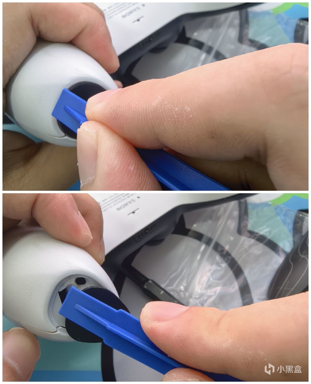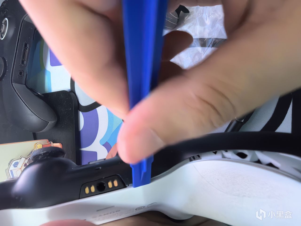先拆ds5底部的裝飾條,這個拆起來是有技巧的,用撬棒抵住裝飾條與外殼間的縫隙後向手柄正面發力拽,而不是把撬棒伸進縫隙翹(縫隙太小進不去的)。
