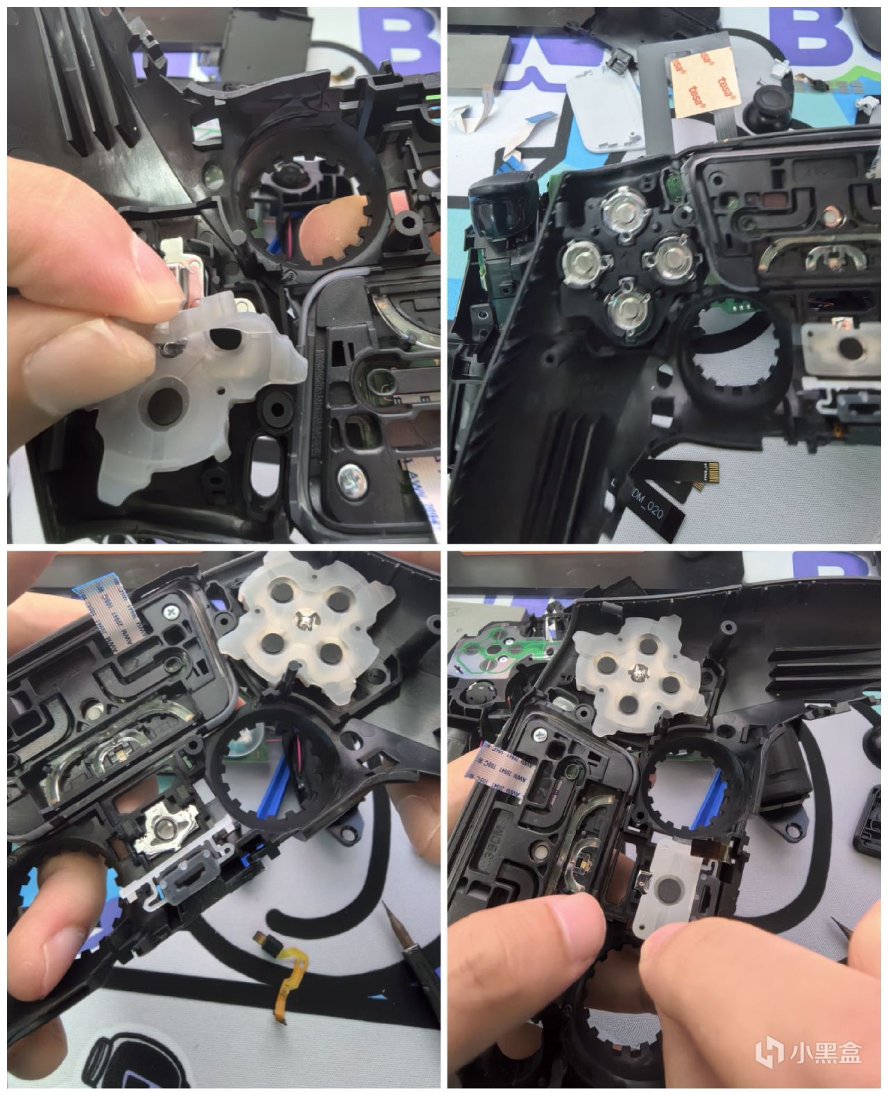 下面把十字鍵、功能鍵、PS鍵、麥克風全都拆下來,注意功能鍵下面那個黑色的橡膠墊不要忘了,沒了他按鍵會十分鬆散的,順序隨意。